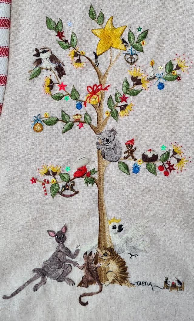 I am offering The Fairies’ Pet for the 3 day tuition, and my delightful new design, an Aussie Christmas Stocking for the 2 day tuition.